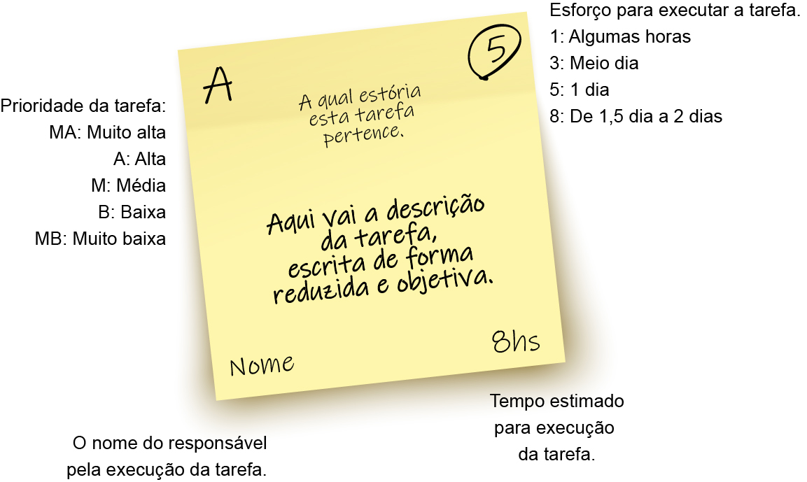 - Criar um post-it em que a primeira tarefa do Sprint Backlog esteja descrita e que inclua seu nível de prioridade, a classificação de esforço para executá-la, a quantidade de horas estimada para sua conclusão, o nome do responsável, a estória à qual a tarefa pertence e sua descrição resumida. A escolha desses dados fica a seu critério, mas precisam ser coerentes com a tarefa.