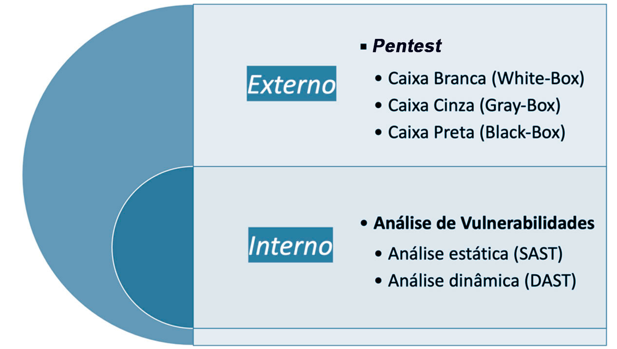 O teste de caixa preta é feito sem nenhum conhecimento prévio, a partir de ambiente externo. Os testes de caixa cinza e de caixa branca também são feitos a partir do ambiente externo, porém com informações prévias parciais ou totais, respectivamente. Já o SAST e o DAST são feitos a partir do ambiente interno.
