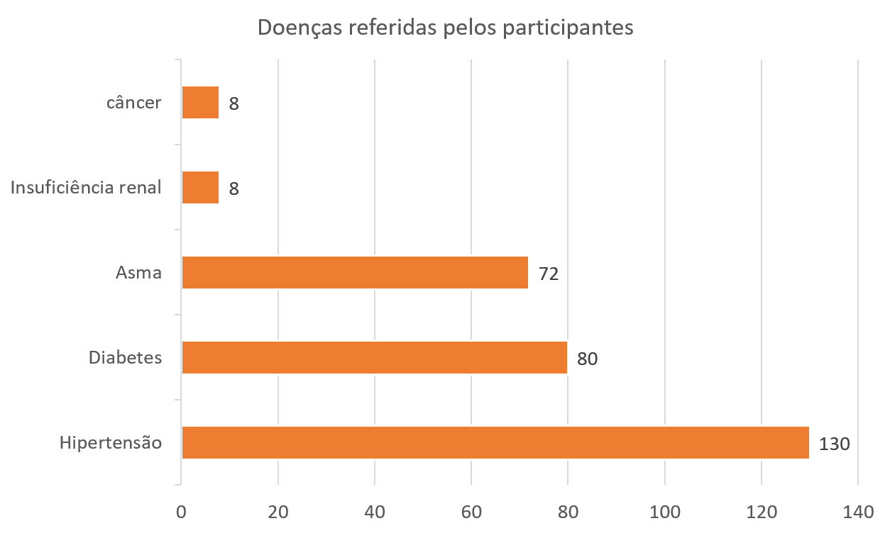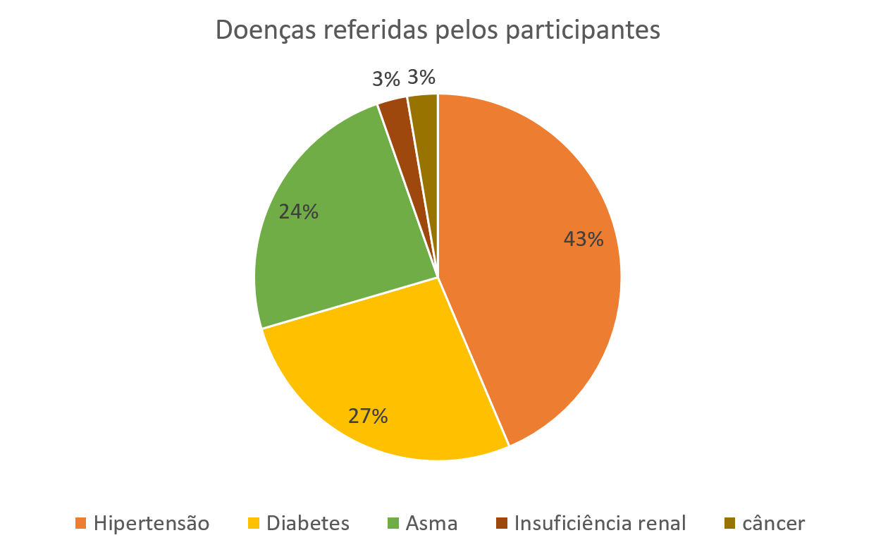 Nesta situação, os pesquisadores encontraram dificuldades com a apresentação dos dados no gráfico tipo “pizza”, pois ele somava mais que 100%, ou seja, alguns participantes haviam referido ter mais de uma doença. Assim sendo, utilizar esse formato não seria adequado.