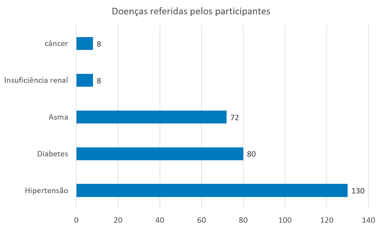 Os pesquisadores apresentaram, em gráfico tipo linha, os dados referentes às doenças referidas pelos participantes da pesquisa.
