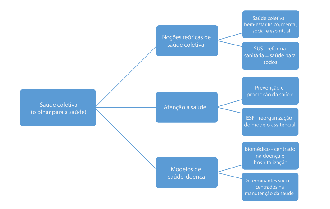 Nesta unidade de ensino, abordaremos conceitos da saúde coletiva e sua diferença com relação à saúde pública; estudaremos a aplicação dos conhecimentos pelos profissionais de saúde na saúde coletiva, abrangendo o conceito mais vasto para a palavra “saudável”, que vai muito além da ausência de doença; trataremos de conceitos históricos, passando pela reforma sanitária, passando pela reforma sanitária, para entender a atenção primária até chegarmos à Estratégia Saúde da Família (ESF). Após a compreensão histórica, podemos identificar como os modelos de saúde-doença influenciam o modelo assistencial nacional. No esquema abaixo podemos identificar os principais temas a serem abordados bem como seus enfoques. Observe a Figura 1.1: