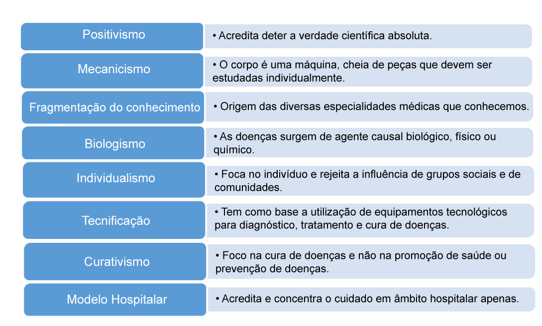 Pois o modelo biomédico tinha ideias positivistas (detenção da verdade científica absoluta); por estudar o corpo em segmentos, propiciou o surgimento de várias especialidades diferentes na medicina; e tinha o foco voltado para tratamento e cura de doenças apenas.