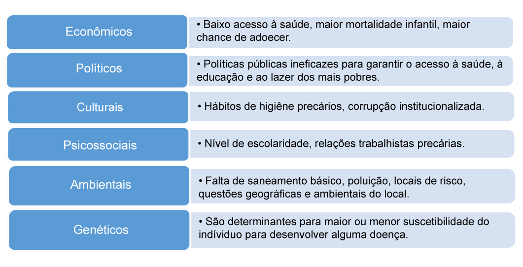 A ideia do modelo de determinação social da doença nasce junto com um movimento denominado Medicina Social, ainda no século XIX. Essa corrente afirmava, de maneira geral, que os indivíduos adoecem e morrem de acordo com suas condições de vida, de modo que eram considerados, então, os fatores sociais, culturais e econômicos.