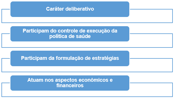 Os Conselhos de Saúde apresentam caráter deliberativo, isso significa que têm poder de tomar decisões. Eles atuam na formulação de estratégias e no controle da execução das políticas nas diferentes esferas. Logo, podemos entender que há Conselhos de Saúde municipais, estaduais e federais.