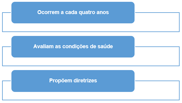 As Conferências de Saúde ocorrem a cada quatro anos, em todas as esferas do governo, com participação de diversos segmentos sociais e têm por objetivo avaliar a situação da saúde e propor novas diretrizes para formulações de políticas de saúde. As propostas das Conferências Municipais são levadas à Conferências Estaduais que, por sua vez, discutem e avaliam os pontos mais relevantes para a apresentação na Conferência Nacional de Saúde. Dessa forma, é possível ter a representatividade de vários segmentos sociais, fator que legitima e organiza as discussões e elaborações de políticas públicas para saúde. As características das Conferências de Saúde estão resumidas na Figura 2.8.
